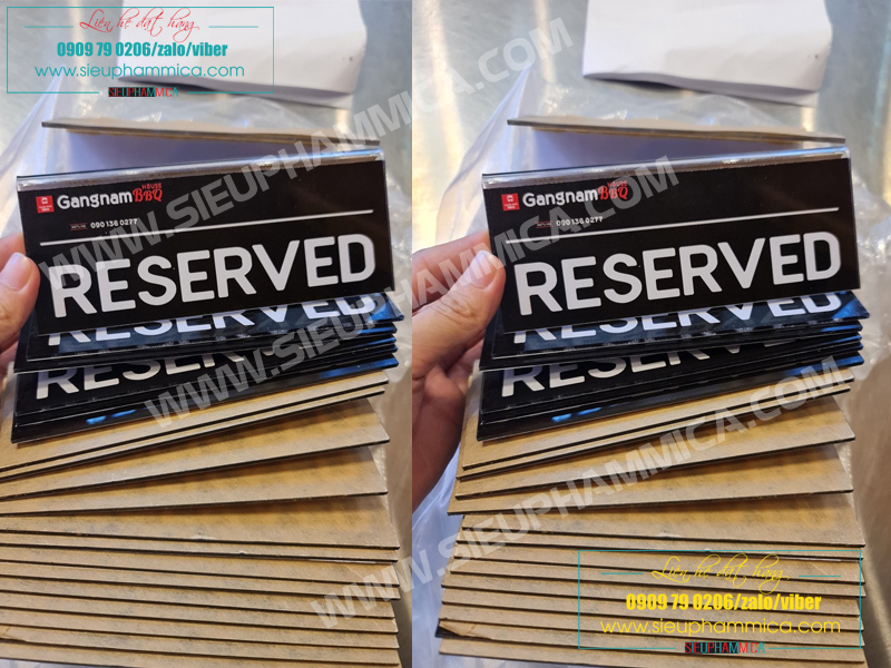 Biển đã đặt bàn, Biển reserved mica là sản phẩm được làm từ mica Đài Loan, được cắt uốn in ấn, in decal dán thành những hình dáng biển với nội dung đã đặt chỗ dành cho các nhà hàng, khách sạn, quán ăn,..