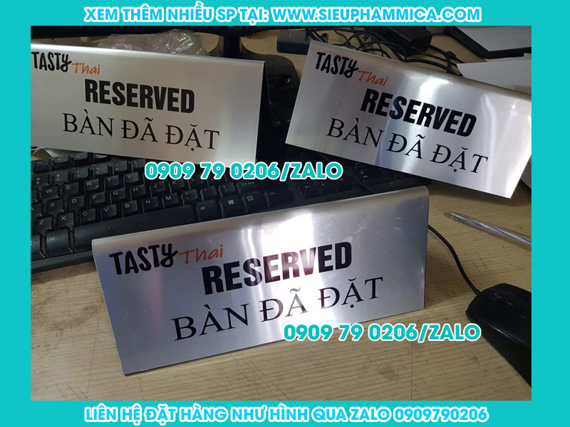 Biển đã đặt bàn, Biển reserved mica là sản phẩm được làm từ mica Đài Loan, được cắt uốn in ấn, in decal dán thành những hình dáng biển với nội dung đã đặt chỗ dành cho các nhà hàng, khách sạn, quán ăn,..
