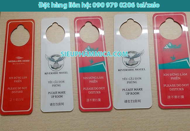 Biển được gắn ở cánh cửa của mỗi phòng khách sạn mỗi khi cần thiết.Sản phẩm được dùng trong khách sạn, nhà nghĩ, resort hạng sang trọng,… Biển do not disturb cũng giống như các sản phẩm khác có rất nhiều mẫu mã cũng như kích sao cho phù hợp và đẹp mắt nhất. Thường khách hàng của SIEUPHAMMICA.COM thường làm với kích thước rộng 10 x dài 15 (cm), in 1 mặt hoặc 2 mặt đều được. Với tính năng và độ thẫm mỹ của sản phẩm, SIEUPHAMMICA.COM tin chắc rằng quý khách sẽ hoàn toàn hài lòng về chất lượng sản phẩm của chúng tôi.