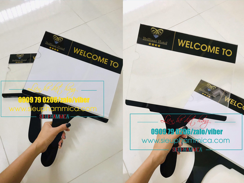 Biển đón cầm tay được làm từ chất liệu mica bền đẹp phù hợp với nhu cầu và mẫu mã của quý khách hàng.Biển đón cầm tay có ưu điểm là dễ dàng di chuyển, giúp khách hàng có thể nhìn nhận rõ ràng.