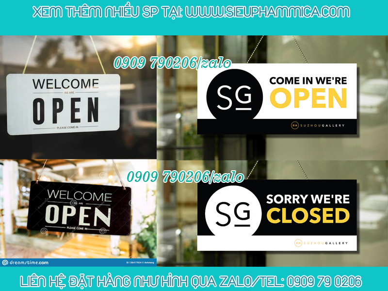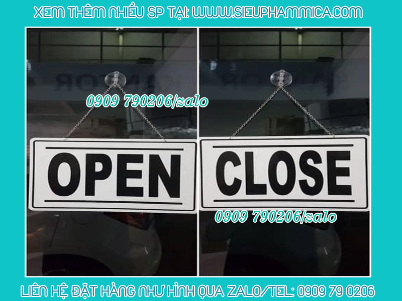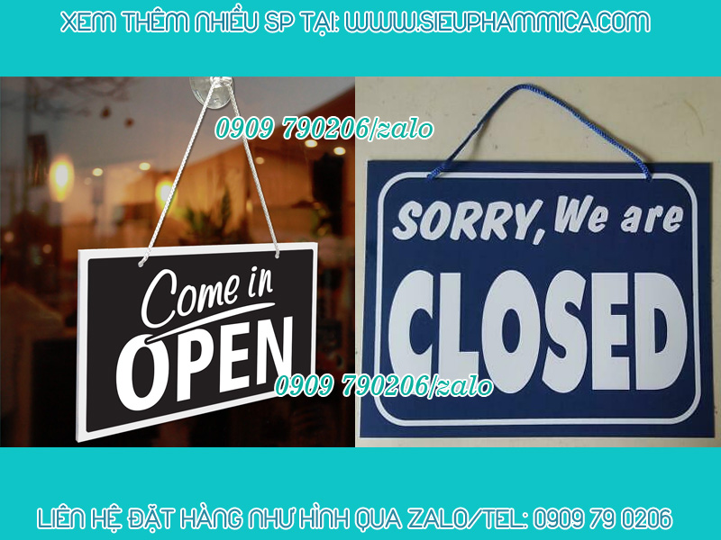 Biển đóng cửa mở cửa bằng mica là sản phẩm thông dụng hiện nay. Sản phẩm được treo trước cửa ra vào của cửa hàng, store quần áo, nhà hàng, khách sạn, quán ăn, văn phòng,...