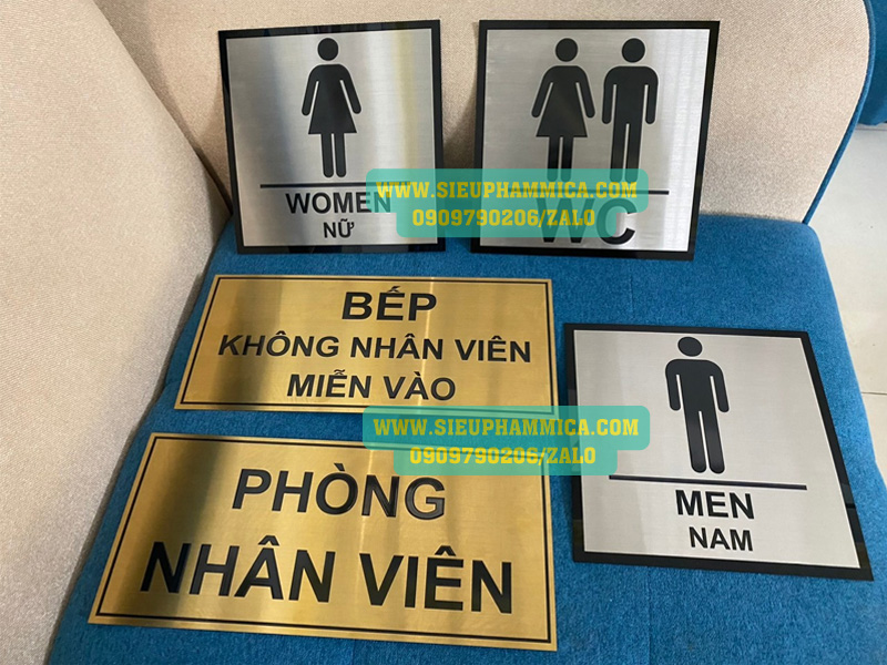 Biển phòng ban inox vàng, biển wc inox vàng, biển inox trắng xước, biển inox vàng gương