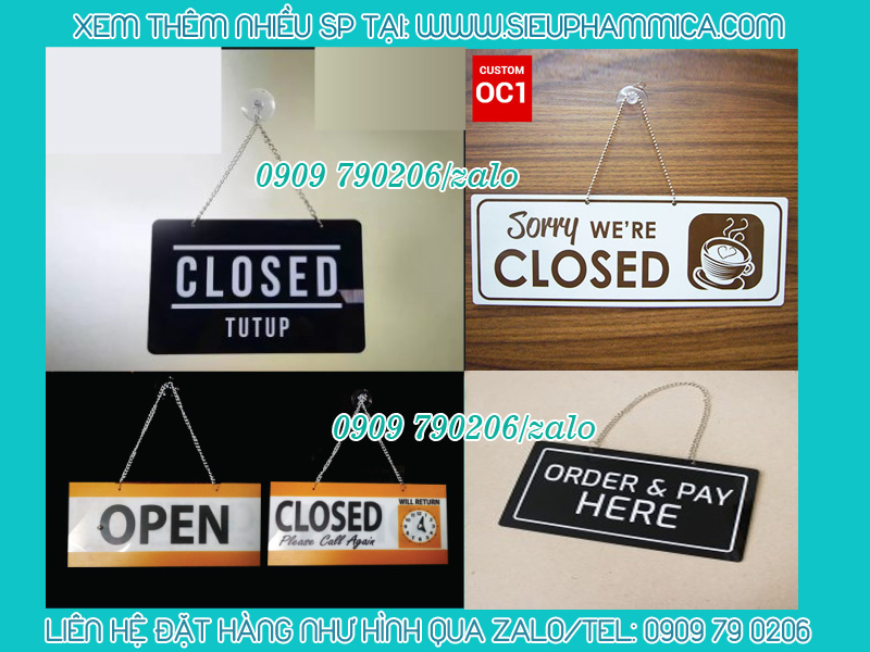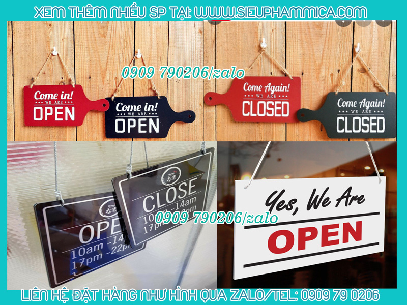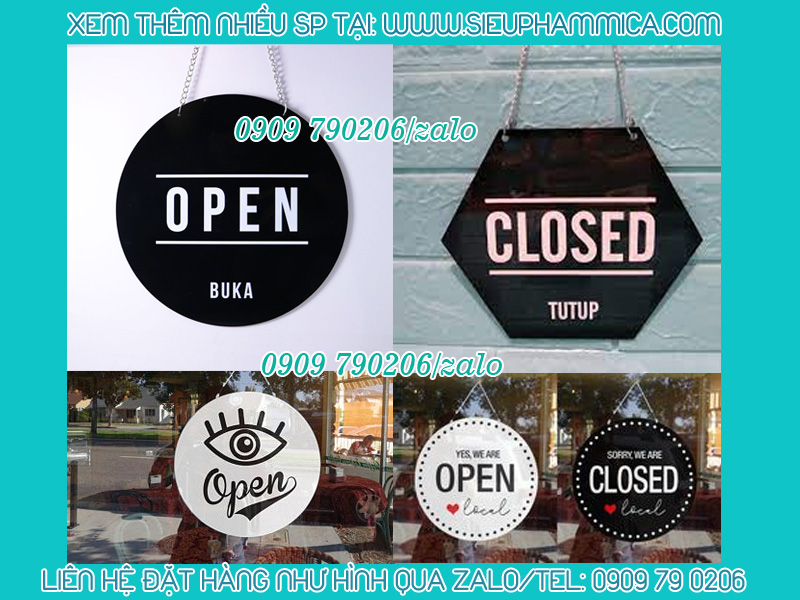 Biển đóng cửa mở cửa bằng mica là sản phẩm thông dụng hiện nay. Sản phẩm được treo trước cửa ra vào của cửa hàng, store quần áo, nhà hàng, khách sạn, quán ăn, văn phòng,...