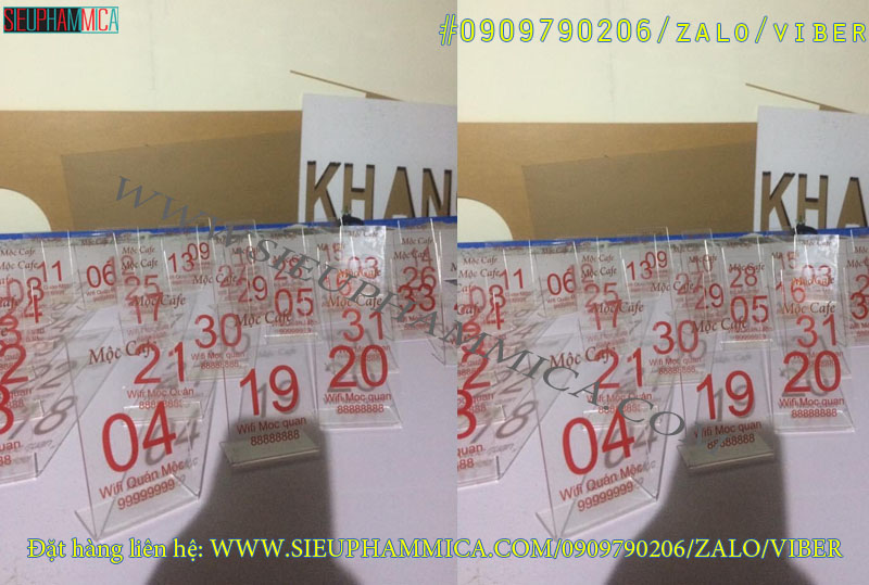 Biển số bàn mica, thẻ số bàn, số chờ mica, kệ số mica để bàn là những vật dụng mà hẳn các bạn thường bắt gặp ở một số nơi như nhà hàng, quán café… Và chắc chắn rằng một số lần nào đó bạn cũng rất tò mò cầm nó lên và ngắm nghía phải không? Không chỉ dùng để trang trí mà những biển số mica để bàn, kệ số bàn mica còn là những vật dụng tạo sự thiện cảm cho khách hàng khi đến một quán café hay một nhà hàng. Đây là thành công rất lớn của ngành quảng cáo, mà đặc biệt là những công ty chuyên sản xuất, thiết kế các sản phẩm từ mica.