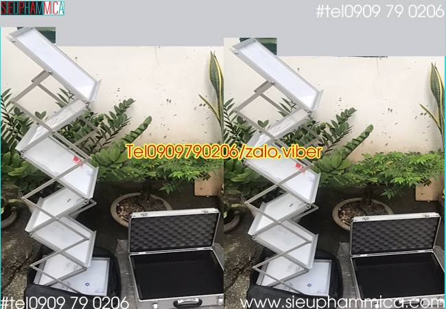 Chất liệu: Khung kệ brochure được làm từ hợp kim nhôm cao cấp, mặt kệ được làm bằng mica trong suốt, có vali hoặc túi đựng chuyên dụng.