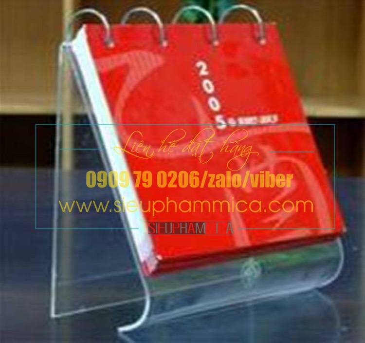 Đế lịch mica là sản phẩm quà tặng được làm từ mica dùng để treo những cuốn lịch để trên bàn làm việc, làm quà tặng khách hàng tri ân.