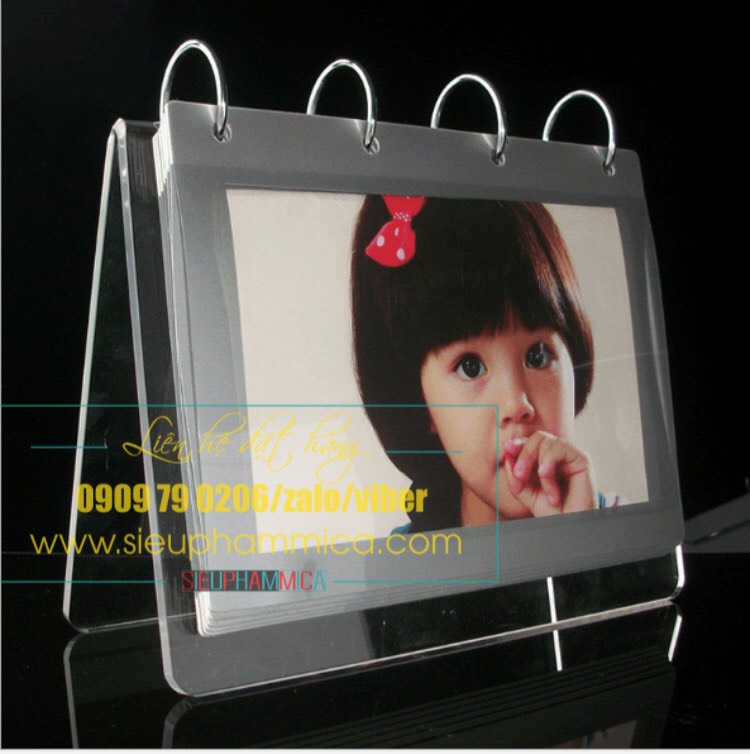 Đế lịch mica được gia công từ mica đài loan 3mm, 4mm, 5mm,… có khoen bên trên và có chân chống.