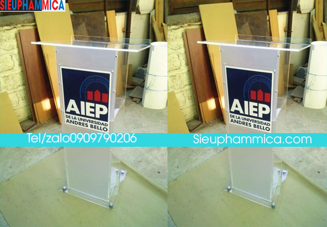 Bục phát biểu bằng mica Đài Loan chiều dầy 8mm, 10mm, có đủ kích thước và màu sắc theo yêu cầu khách hàng. Được chế tạo từ máy cắt laser, máy đánh bóng, dễ bảo quản, làm sạch nhanh bằng nước xà phòng, bền và ổn định lý hóa theo thời gian.