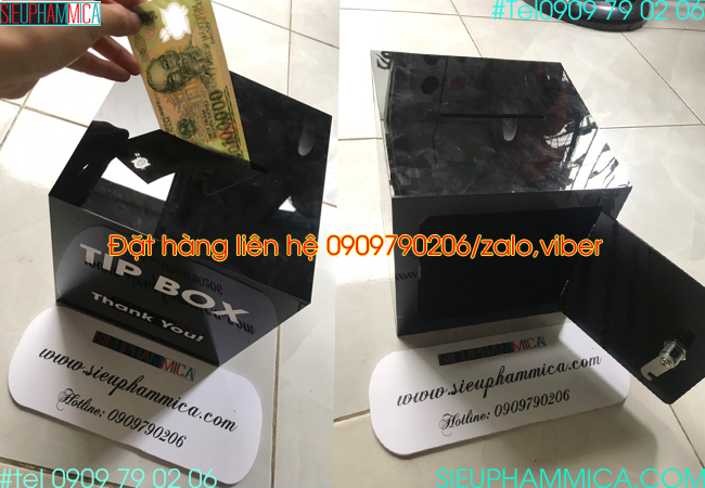 Từ những tấm mica, chúng tôi với sự khéo tay của người thợ thiết kế đảm bảo sự phù hợp nhất đối với quý khách hàng. Thùng đựng tiền tips được gia công, cắt CNC, máy laser công nghệ cao đáp ứng sự phù hợp nhất đối với quý khách hàng.