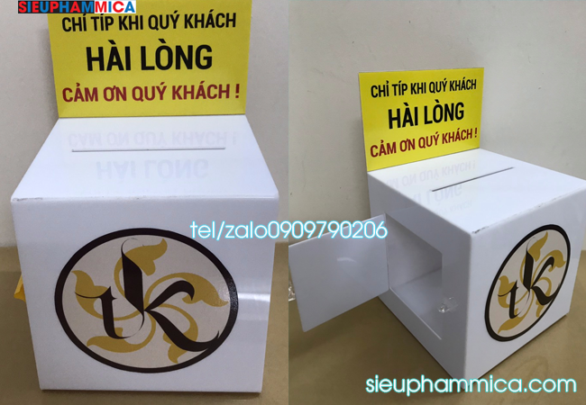 Sản phẩm hộp mica làm theo yêu cầu, hộp tip box mica, hộp tip tiền lẻ là sản phẩm được dùng ở các quầy lễ tân, thu ngân, khi thanh toán sẽ thừa lại khoản tiền nhỏ có thể bỏ vào đó không hoạch toán vào doanh thu của nhà hàng, khách sạn, cửa hàng, công ty Ngoài thiết kế gia công hộp tip – box mica chúng tôi còn cung cấp rất nhiều sản phẩm hữu ích từ mica như: kệ menu mica, kệ danh thiếp mica, kệ sách mica, kệ mỹ phẩm mica…Mọi nhu cầu về các sản phẩm tiện ích vui lòng liên hệ với chúng tôi để được phục vụ một cách tốt nhất.