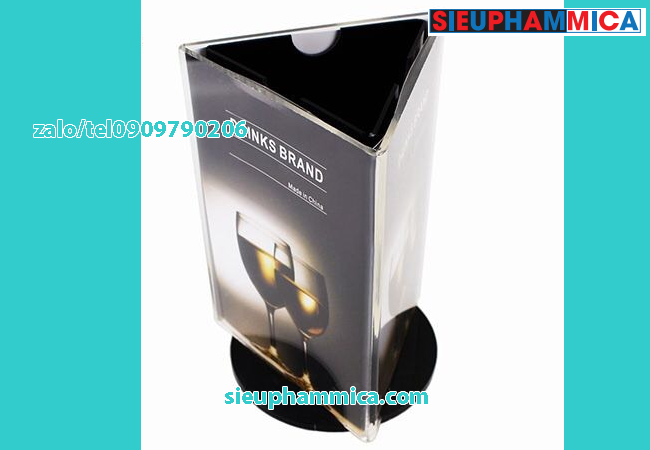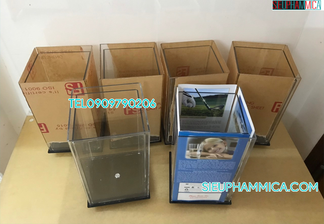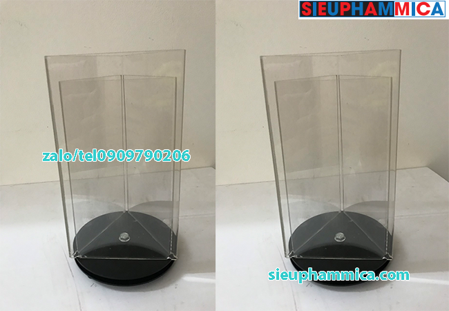 SIEUPHAMMICA.COM chúng tôi có kệ mica xoay để bàn có đế được làm từ 2 tấm mica xoay màu đen dày 2mm, kích thước đế cao 30cm, ngang 25cm, sau 25cm. Phần thân có thể được làm từ mica trong, mica màu đen hay màu xanh coban,…. Kệ mica xoay để bàn được thiết kế gồm 16 ô sử dụng trên một kệ với độ rộng 16 hộp là 2cm. Tờ rơi để vào kệ cao 10cm rộng 18cm. Kệ mica xoay để bàn có thể xoay bằng tay khi cần lấy theo mong muốn.