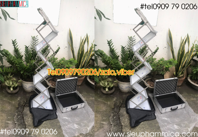 Chất liệu: Khung kệ brochure được làm từ hợp kim nhôm cao cấp, mặt kệ được làm bằng mica trong suốt, có vali hoặc túi đựng chuyên dụng.