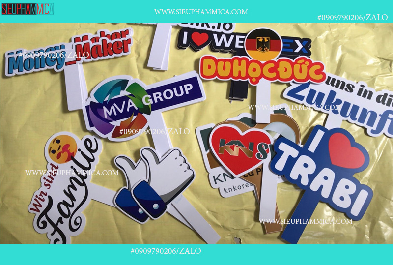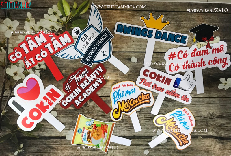 Được sử dụng nhiều nhất trong hầu hết các chương trình và sự kiện, hashtag cầm tay luôn được ưa chuộng nhất trên thị trường. Cấu tạo của nó gồm có 2 phần chúng là phần thân và phần đế. PP là chất liệu chính dùng để làm nên hashtag vì tính nhẹ bền và dễ tạo hình bằng máy hoặc cắt bằng tay. Phần thân được in các nội dung hashtag với nhiều nội dung khác nhau tùy thuộc vào nhà tổ chức. Do đó mẫu mã của chúng rất đa dạng và luôn được sử dụng trong các chiến lược marketing của các công ty