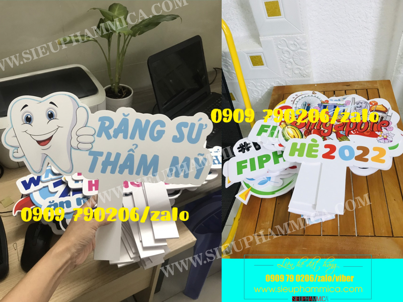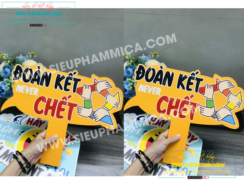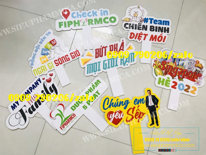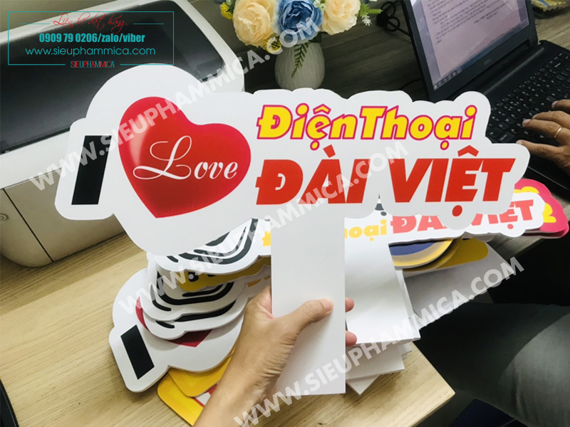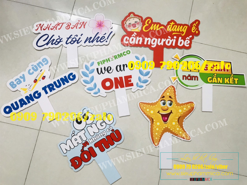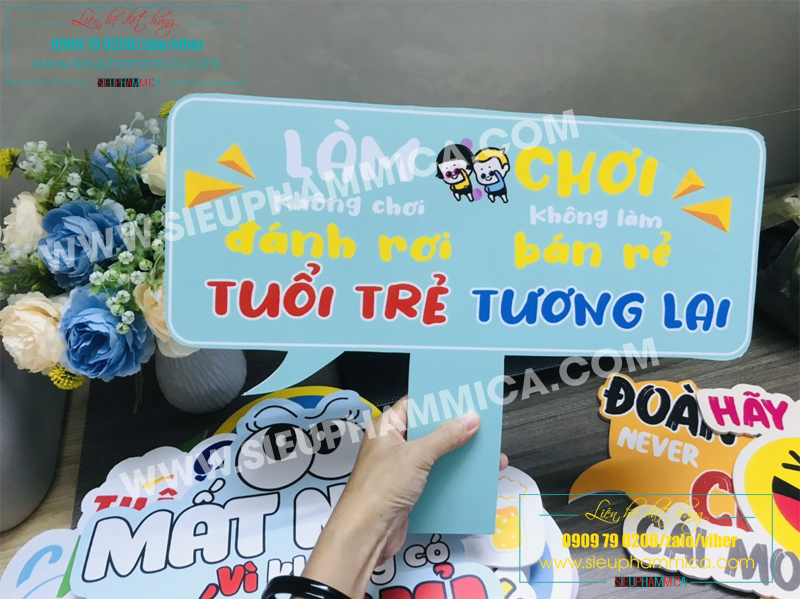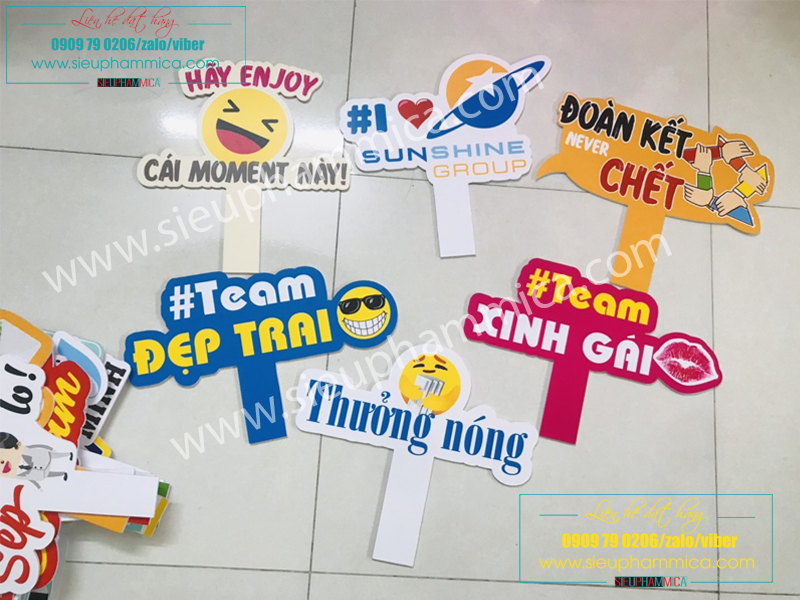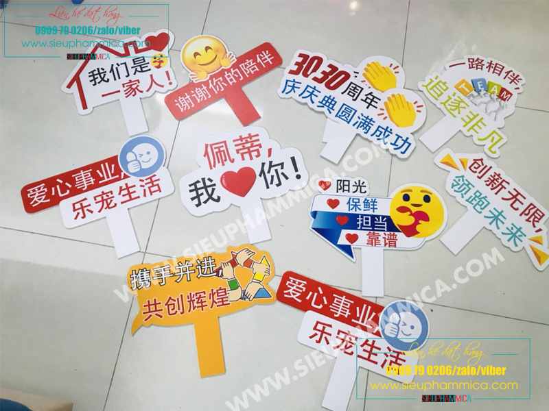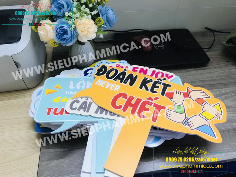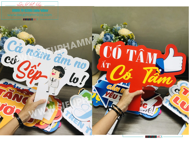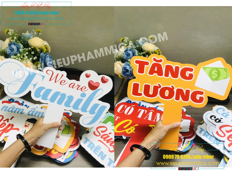 WWW.SIEUPHAMMICA.COM là đơn vị chuyên nhận thiết kế và in hashtag cầm tay chuyên nghiệp. Bảng hashtag được thiết kế nhiều kích thước khác nhau tùy vào nhu cầu của khách hàng. Tuy nhiên, kích thước thông thường của một bảng hashtag chụp ảnh vừa phải rõ chữ khi chụp là khổ A3.