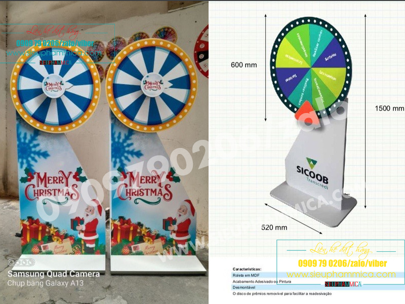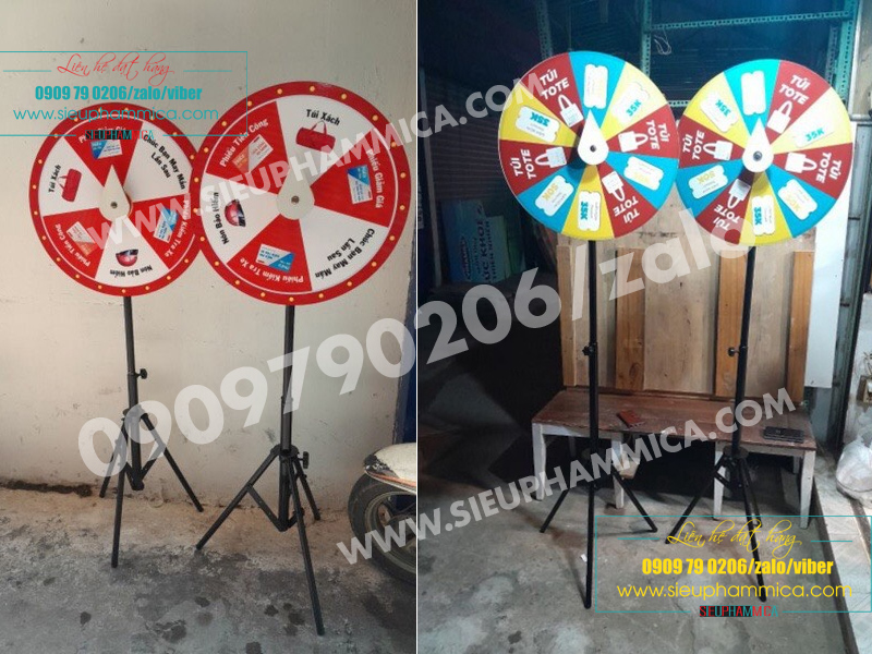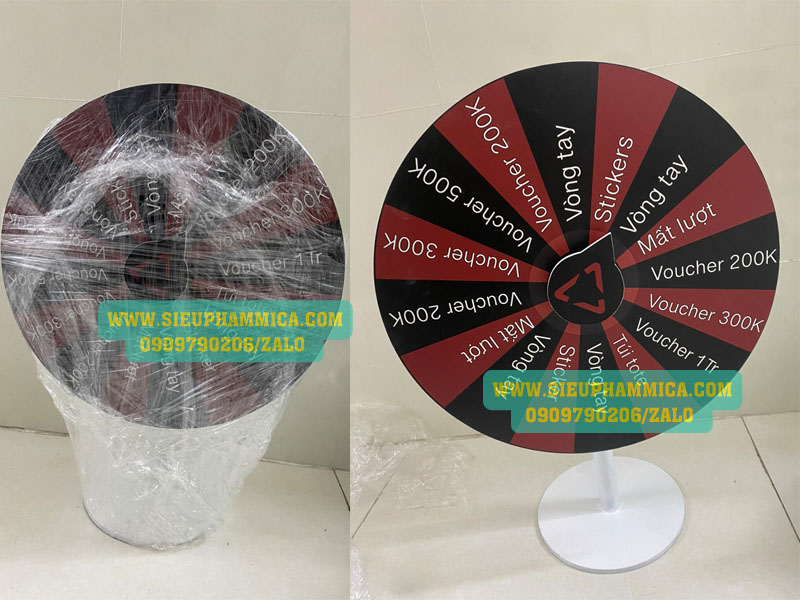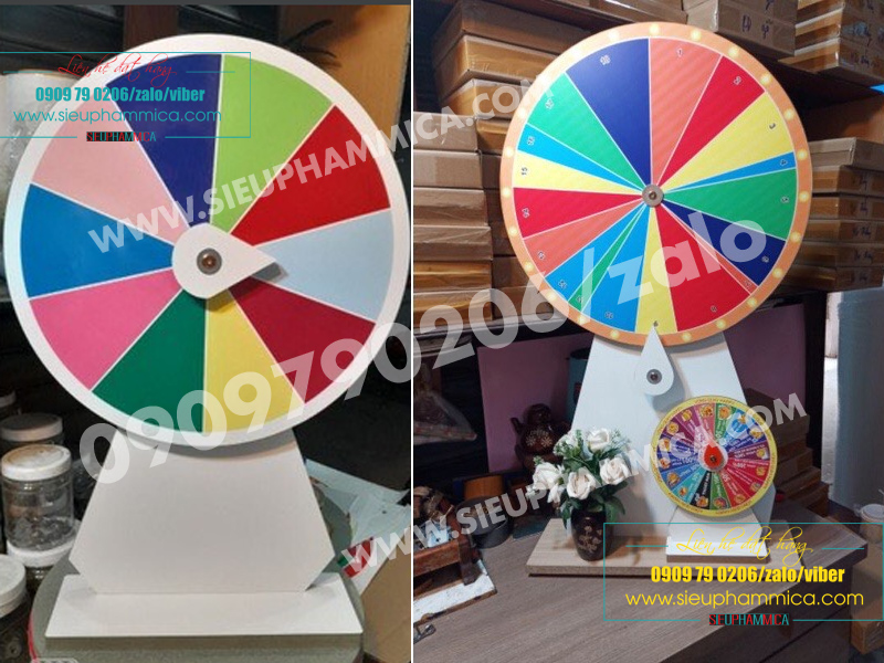 Vòng quay trúng thưởng là sản phẩm được làm từ gỗ MDF công nghiệp và chân được làm từ gỗ hoặc sắt tròn được sơn màu theo theo yêu cầu. mặt vòng quay được tràn decal vì thế vòng quay may mắn được làm từ SIEUPHAMMICA.COM là sản phẩm đảm bảo chất lượng tối đa. Có thể thay đổi kích thước chân vòng quay cao thấp theo ý muốn. Bên cạnh đó, chúng ta có thể tái sử dụng nhiều lần sau những lần sử dụng ko còn phù hợp nội dung trúng thưởng.