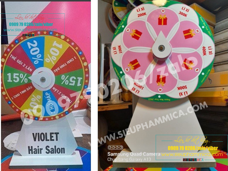 Vòng quay trúng thưởng tại SIEUPHAMMICA.COM là sản phẩm có thể xoay tròn được làm từ gỗ và sắt, được chế tác thành hình dạng vòng quay với nội dung theo yêu cầu của khách.