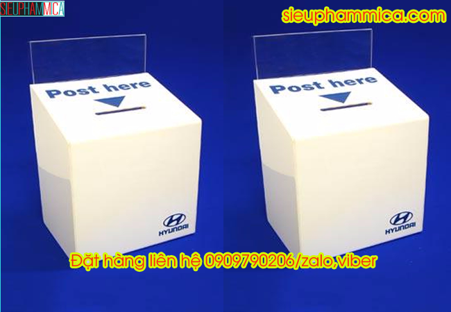 Sử dụng chất liệu Mica trong Đài Loan, boxtip được thiết kế với kích thước cao 20cm, ngang 15cm, sâu 10cm, trên mặt hộp có đựng 1 standee ngang 20xcao 15cm, khóa có thể làm mặt sau, trên, ngang hoặc vị trí phù hợp với yêu cầu của khách hàng.