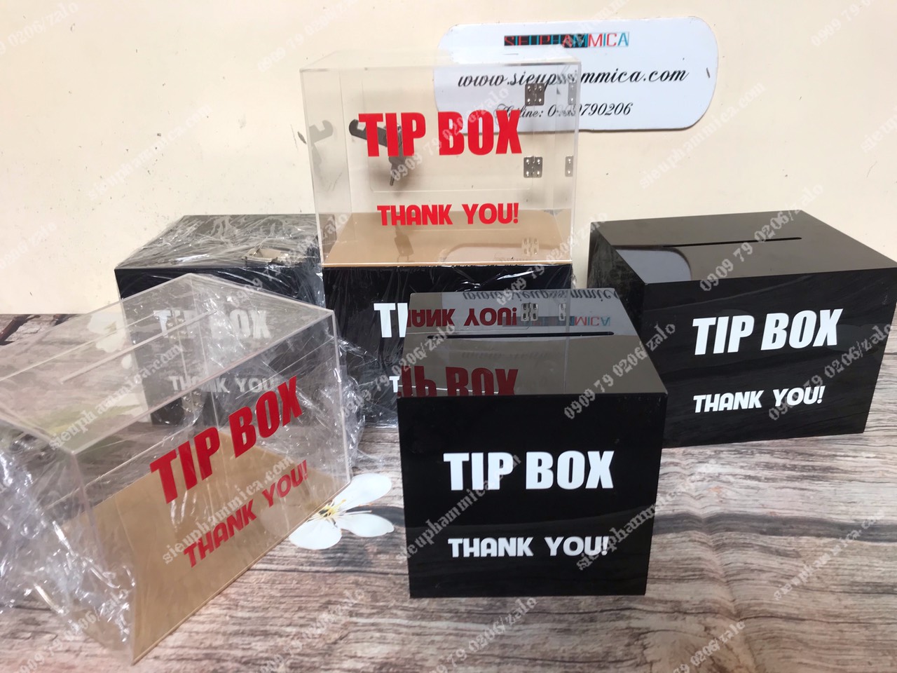 Hộp tip box Mica hay còn gọi là hộp đựng tiền tip được làm từ chất liệu Mica.