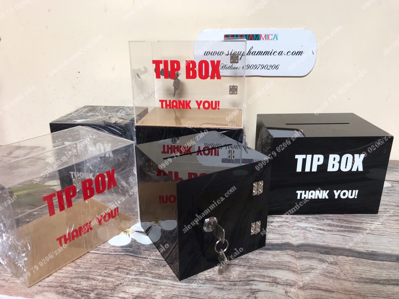 Kích thước hộp tip box Mica Thông thường như sau: 20x20x20, 20x15x15, 15x15x15cm, hoặc những kích thước khác đều được.