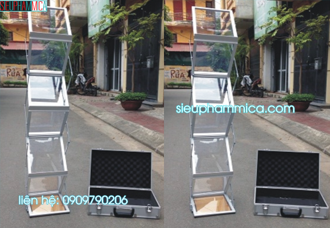 Chất liệu: Khung kệ brochure được làm từ hợp kim nhôm cao cấp, mặt kệ được làm bằng mica trong suốt, có vali hoặc túi đựng chuyên dụng.