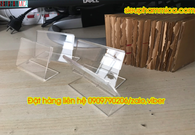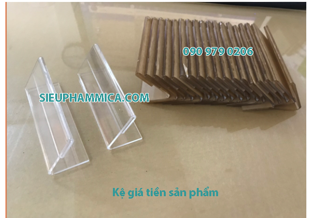 Kệ giá tiền, kệ thông tin sản phẩm được làm từ mica trong Đài Loan bóng sáng, được cắt uốn tỉ mỉ, có một khe nhỏ để lồng được vừa 1 tờ giấy vào bên trong. Do tính chất trong suốt của mica nên chúng ta có thể thấy được thông tin trên giấy.