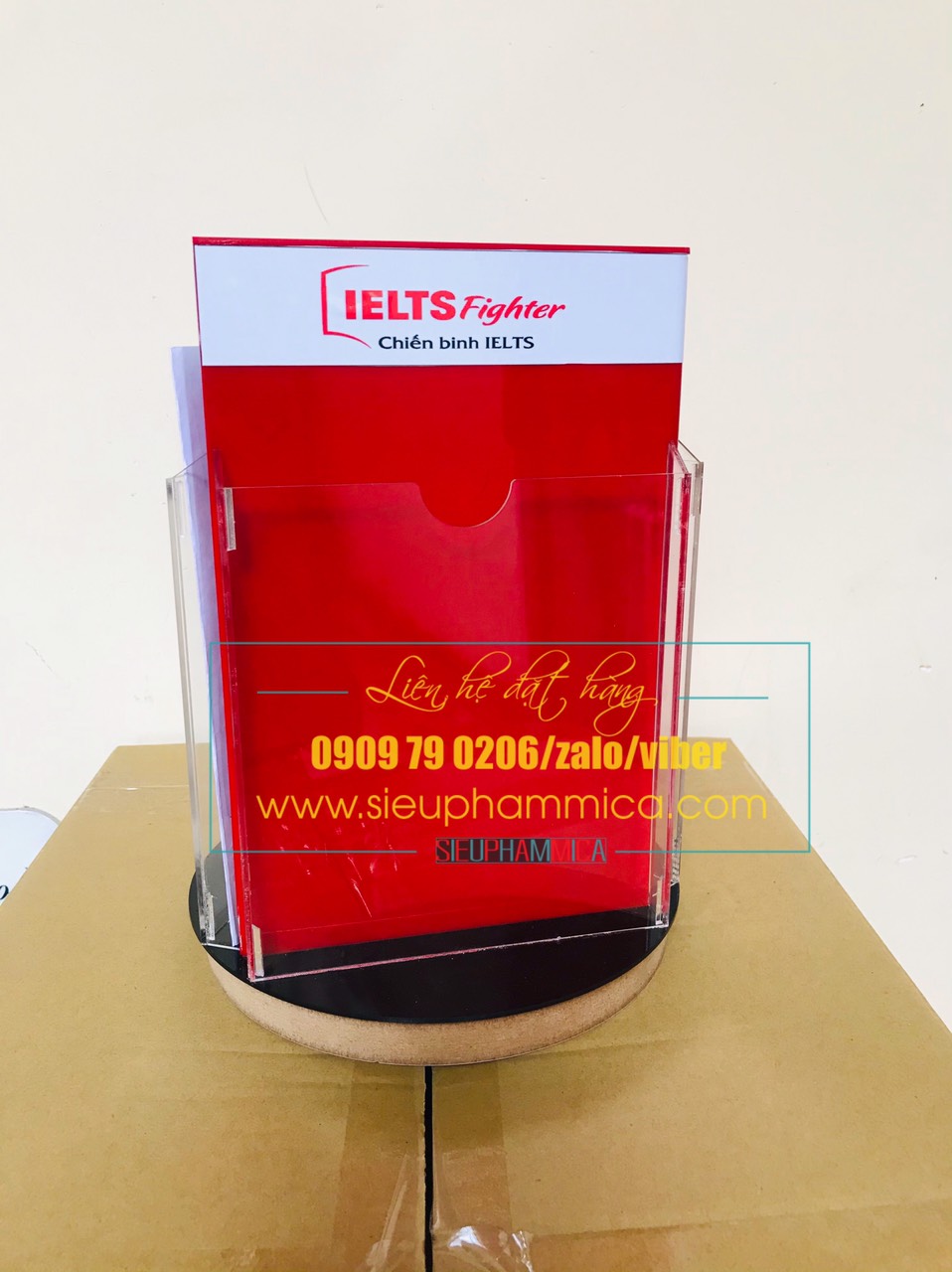 SIEUPHAMMICA.COM chúng tôi có kệ mica xoay để bàn có đế được làm từ 2 tấm mica xoay màu đen dày 2mm, kích thước đế cao 30cm, ngang 25cm, sau 25cm. Phần thân có thể được làm từ mica trong, mica màu đen hay màu xanh coban,…. Kệ mica xoay để bàn được thiết kế gồm 16 ô sử dụng trên một kệ với độ rộng 16 hộp là 2cm. Tờ rơi để vào kệ cao 10cm rộng 18cm. Kệ mica xoay để bàn có thể xoay bằng tay khi cần lấy theo mong muốn.