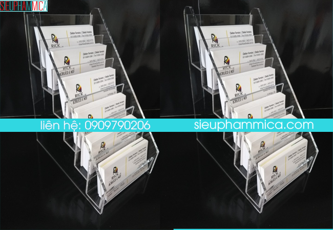 Kệ mica card visit được thiết kế theo mẫu mã riêng của khách hàng, đối tác với nhiều kiểu mẫu kệ mica đẹp chuyên dùng để trưng bày card visit. Các loại mẫu mã kệ mica card visit được công ty chúng tôi thiết kế gia công theo mọi số .