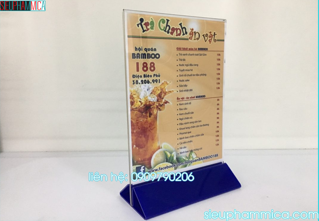 Chuyên cung cấp các loại menu mica, khung thực đơn mica, kệ mica theo thiết kế, yêu cầu khách hàng - Menu mica trong, màu, menu mica có nhiều kích cỡ khác nhau A4. A5, A6.. menu độ dày khác nhau 2mm,3mm... - Menu mica chữ T