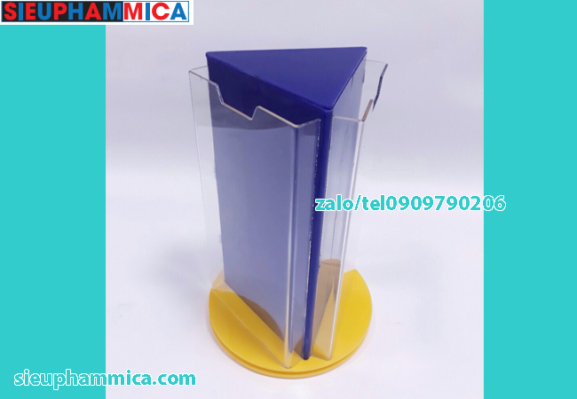 SIEUPHAMMICA.COM chúng tôi có kệ mica xoay để bàn có đế được làm từ 2 tấm mica xoay màu đen dày 2mm, kích thước đế cao 30cm, ngang 25cm, sau 25cm. Phần thân có thể được làm từ mica trong, mica màu đen hay màu xanh coban,…. Kệ mica xoay để bàn được thiết kế gồm 16 ô sử dụng trên một kệ với độ rộng 16 hộp là 2cm. Tờ rơi để vào kệ cao 10cm rộng 18cm. Kệ mica xoay để bàn có thể xoay bằng tay khi cần lấy theo mong muốn.