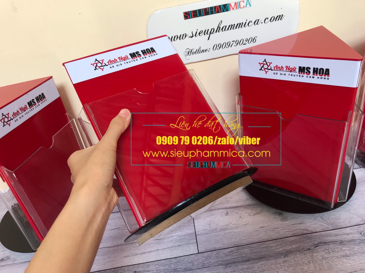 SIEUPHAMMICA.COM là đơn vị chuyên cung cấp các loại kệ mica xoay hoặc nhưng sản phẩm làm từ mica khác như: kệ tờ rơi, kệ giá tiền mica, kệ đựng brochure, kệ menu, các loại biển công ty, biển phòng ban, kệ nước sơn, kệ son môi, kệ mỹ phẩm,…