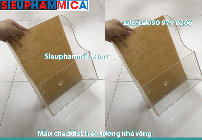 Kệ checklist có nhiều kiểu dáng cũng như kích thước sao cho phù hợp với từng nhu cầu khách hàng. Thường kích thước thông dụng nhất sẽ là A4,A5, A6, hay 10x20. Kệ checklist thường được làm từ Mica 2mm, 3mm, 5mm... được uốn cạnh và cắt dán tỉ mỉ theo tay ghề của thợ nhà sieuphammica.com.
