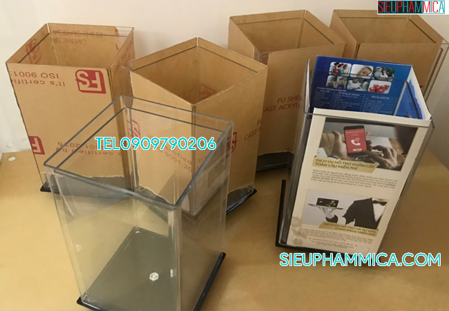 SIEUPHAMMICA.COM chúng tôi có kệ mica xoay để bàn có đế được làm từ 2 tấm mica xoay màu đen dày 2mm, kích thước đế cao 30cm, ngang 25cm, sau 25cm. Phần thân có thể được làm từ mica trong, mica màu đen hay màu xanh coban,…. Kệ mica xoay để bàn được thiết kế gồm 16 ô sử dụng trên một kệ với độ rộng 16 hộp là 2cm. Tờ rơi để vào kệ cao 10cm rộng 18cm. Kệ mica xoay để bàn có thể xoay bằng tay khi cần lấy theo mong muốn.
