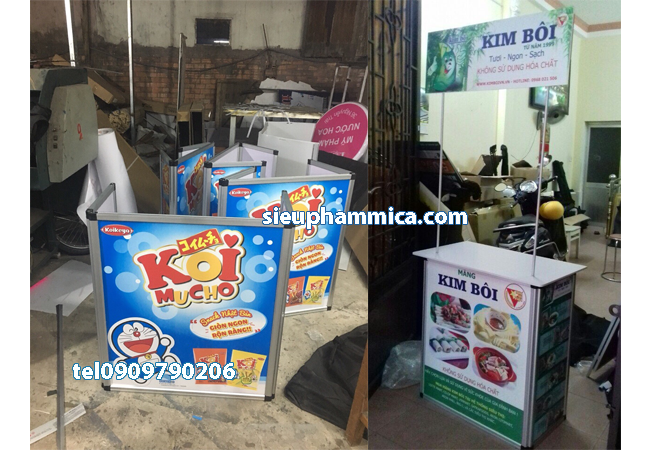 Ngoài việc sản xuất, gia công quầy hàng lưu động theo yêu cầu chúng tôi còn: sản xuất standee sắt, bán standee giá chữ X, bán giá cuốn nhôm, làm mô hình quảng cáo,….