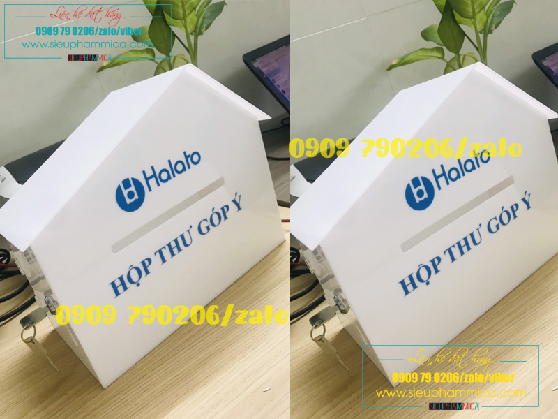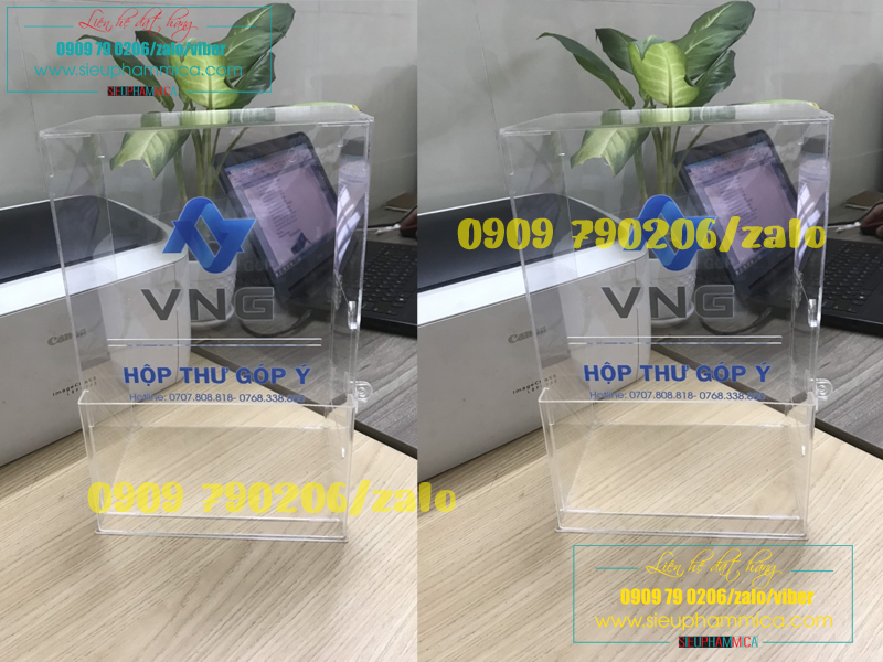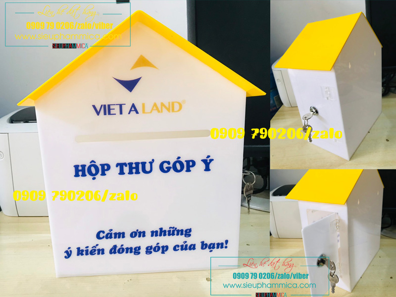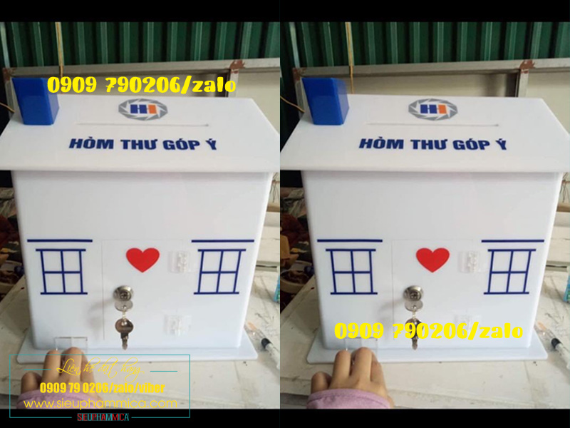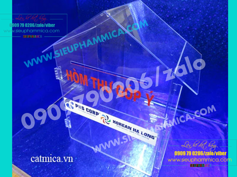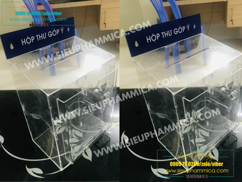 Hòm thư góp ý phải được đặt ở nơi đông người qua lại , vì vậy cần phải thiết kế sao cho thật bắt mắt nhưng vẫn không chiếm nhiều diện tích. Mica là loại vật liệu bền chắc, thẩm mỹ, dễ dàng chế tác theo ý muốn. Hòm thư góp ý làm bằng chất liệu mica dễ dàng vận chuyển vì đặc tính nhẹ.