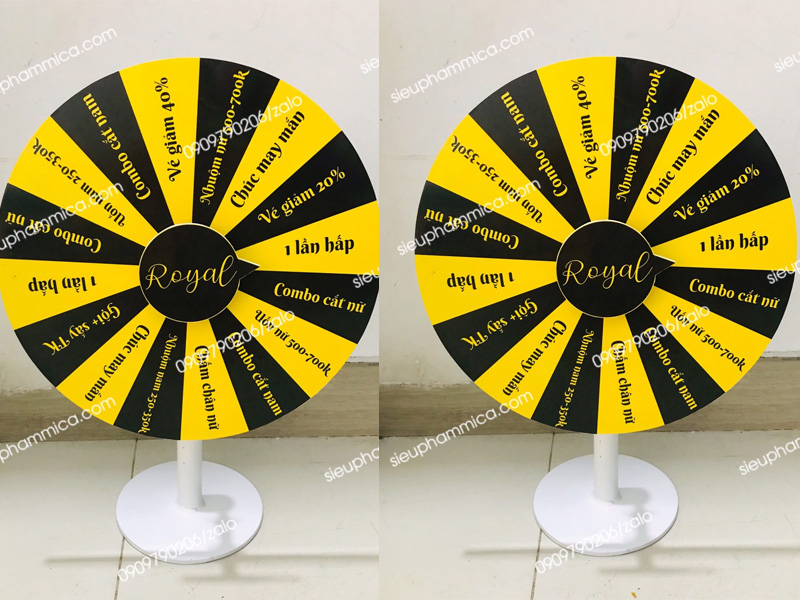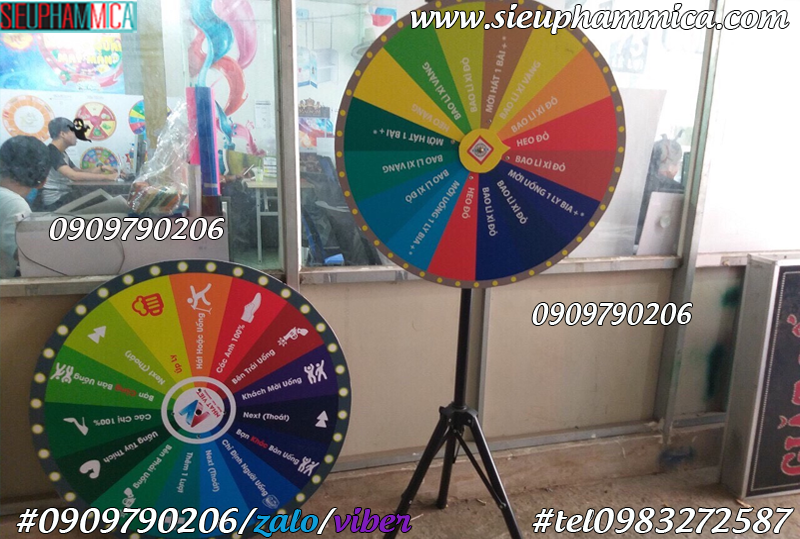 Vòng quay trúng thưởng là sản phẩm được làm từ gỗ MDF công nghiệp và chân được làm từ gỗ hoặc sắt tròn được sơn màu theo theo yêu cầu. mặt vòng quay được tràn decal vì thế vòng quay may mắn được làm từ SIEUPHAMMICA.COM là sản phẩm đảm bảo chất lượng tối đa. Có thể thay đổi kích thước chân vòng quay cao thấp theo ý muốn. Bên cạnh đó, chúng ta có thể tái sử dụng nhiều lần sau những lần sử dụng ko còn phù hợp nội dung trúng thưởng.