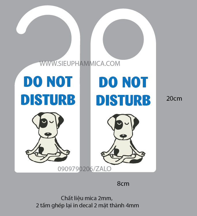 Biển được gắn ở cánh cửa của mỗi phòng khách sạn mỗi khi cần thiết.Sản phẩm được dùng trong khách sạn, nhà nghĩ, resort hạng sang trọng,… Biển do not disturb cũng giống như các sản phẩm khác có rất nhiều mẫu mã cũng như kích sao cho phù hợp và đẹp mắt nhất. Thường khách hàng của SIEUPHAMMICA.COM thường làm với kích thước rộng 8 x dài 20 (cm), in 1 mặt hoặc 2 mặt đều được. Với tính năng và độ thẫm mỹ của sản phẩm, SIEUPHAMMICA.COM tin chắc rằng quý khách sẽ hoàn toàn hài lòng về chất lượng sản phẩm của chúng tôi.
