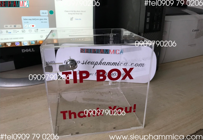 Sử dụng chất liệu Mica trong Đài Loan, boxtip được thiết kế với kích thước cao 20cm, ngang 15cm, sâu 10cm, trên mặt hộp có đựng 1 standee ngang 20xcao 15cm, khóa có thể làm mặt sau, trên, ngang hoặc vị trí phù hợp với yêu cầu của khách hàng.