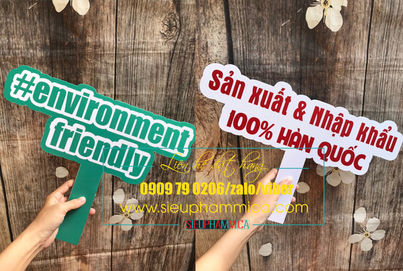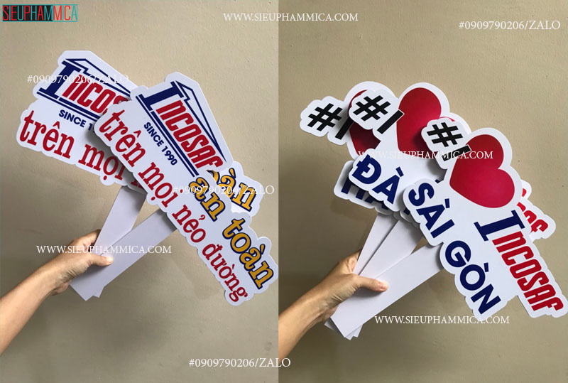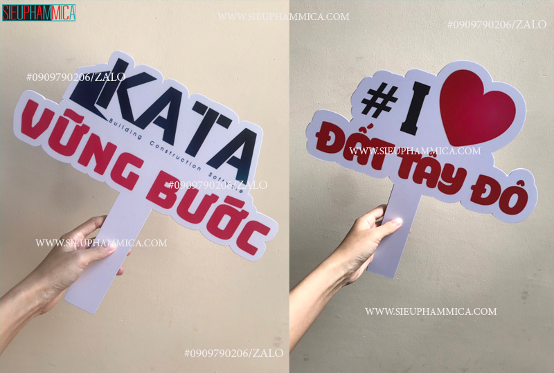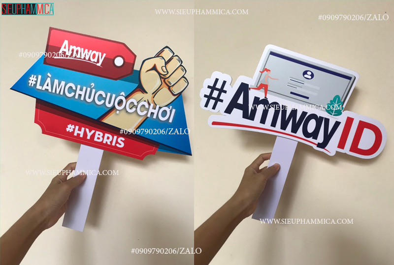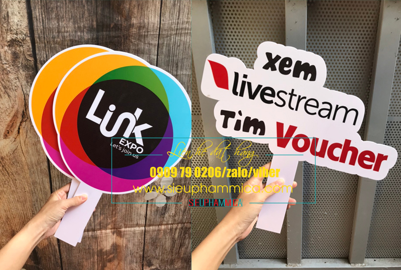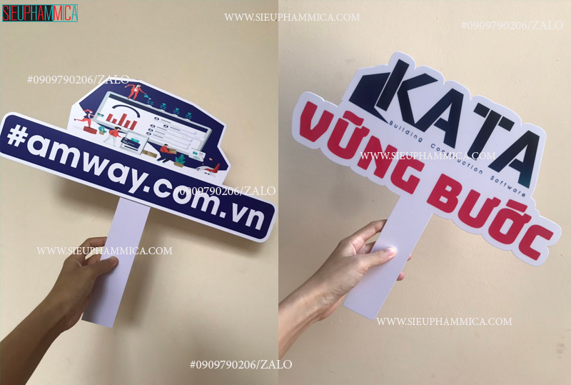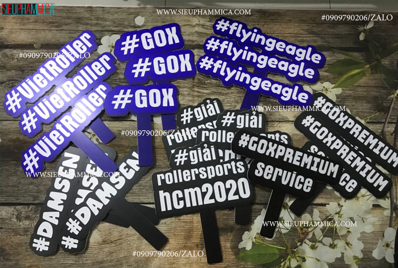 Được sử dụng nhiều nhất trong hầu hết các chương trình và sự kiện, hashtag cầm tay luôn được ưa chuộng nhất trên thị trường. Cấu tạo của nó gồm có 2 phần chúng là phần thân và phần đế. PP là chất liệu chính dùng để làm nên hashtag vì tính nhẹ bền và dễ tạo hình bằng máy hoặc cắt bằng tay. Phần thân được in các nội dung hashtag với nhiều nội dung khác nhau tùy thuộc vào nhà tổ chức. Do đó mẫu mã của chúng rất đa dạng và luôn được sử dụng trong các chiến lược marketing của các công ty