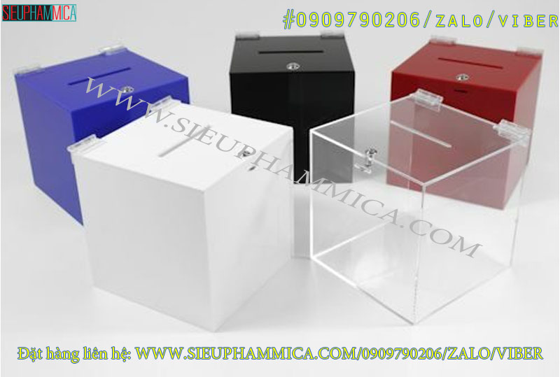 - Về màu sắc, hòm phiếu bốc thăm mica vẫn có thể làm rất nhiều màu sắc khác nhau như: hòm phiếu mica màu vàng, thùng bốc thăm màu xanh lá, Hòm phiếu màu xanh co ban, hòm bầu cử màu đỏ,…
