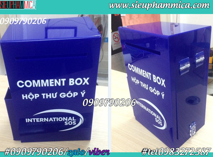 1/ Hòm thư góp ý mica xanh tím SOS-COMMENT BOX