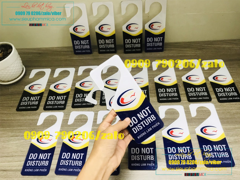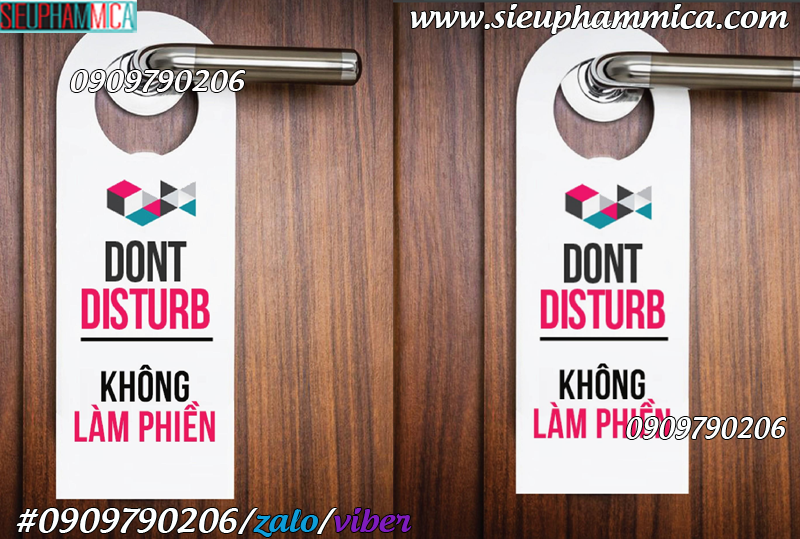 Biển được gắn ở cánh cửa của mỗi phòng khách sạn mỗi khi cần thiết.Sản phẩm được dùng trong khách sạn, nhà nghĩ, resort hạng sang trọng,… Biển do not disturb cũng giống như các sản phẩm khác có rất nhiều mẫu mã cũng như kích sao cho phù hợp và đẹp mắt nhất. Thường khách hàng của SIEUPHAMMICA.COM thường làm với kích thước rộng 9 x dài 23 (cm), in 1 mặt hoặc 2 mặt đều được. Với tính năng và độ thẫm mỹ của sản phẩm, SIEUPHAMMICA.COM tin chắc rằng quý khách sẽ hoàn toàn hài lòng về chất lượng sản phẩm của chúng tôi.