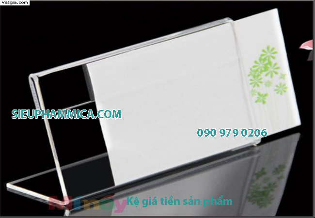 Kệ giá tiền mica là sản phẩm được làm từ mica Đài Loan, được chế tác thành dạng chữ L hoặc dáng chữ A dùng để lồng giấy có chứa thông tin của sản phẩm vào bên trong.